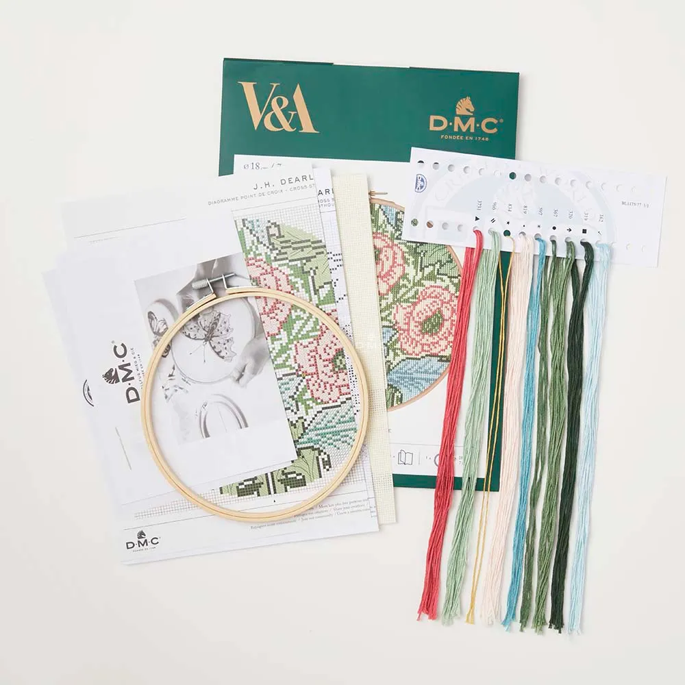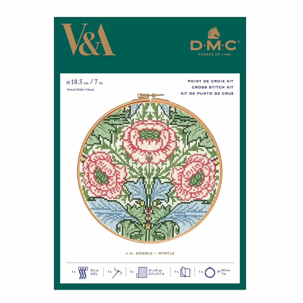 - Deze borduurkit bevat alles wat je nodig hebt om een prachtig kruissteekborduurwerk te maken dat geïnspireerd is op de wereldberoemde Myrtle van John Henry Dearle. Dit kunstwerk komt uit de collectie van The Victoria and Albert Museum in Londen. Het complete pakket bestaat uit de volgende onderdelen: