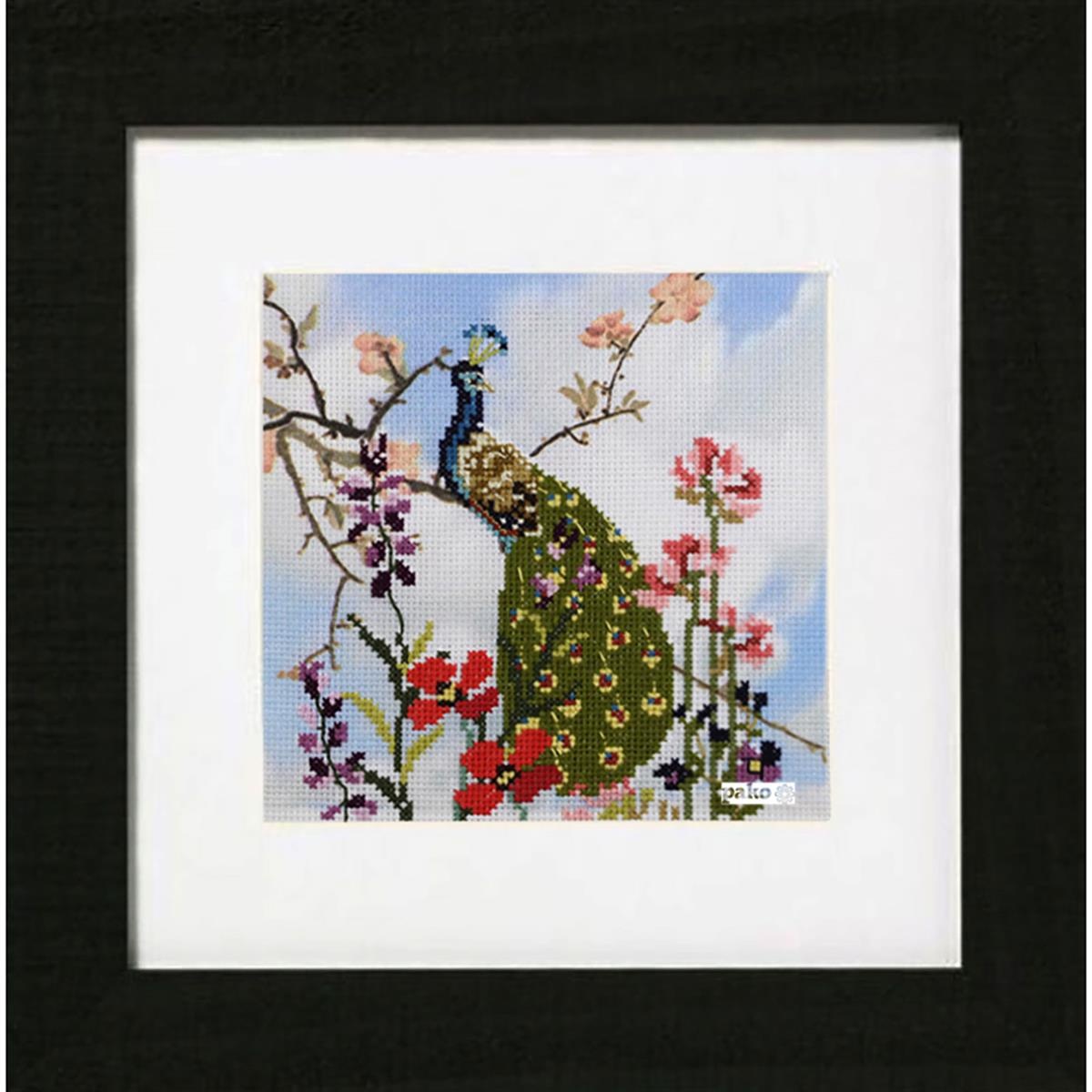 Borduurpakket / kruissteek pakket pauw met bloemen op een deel geprinte stof, een prachtige combinatie.