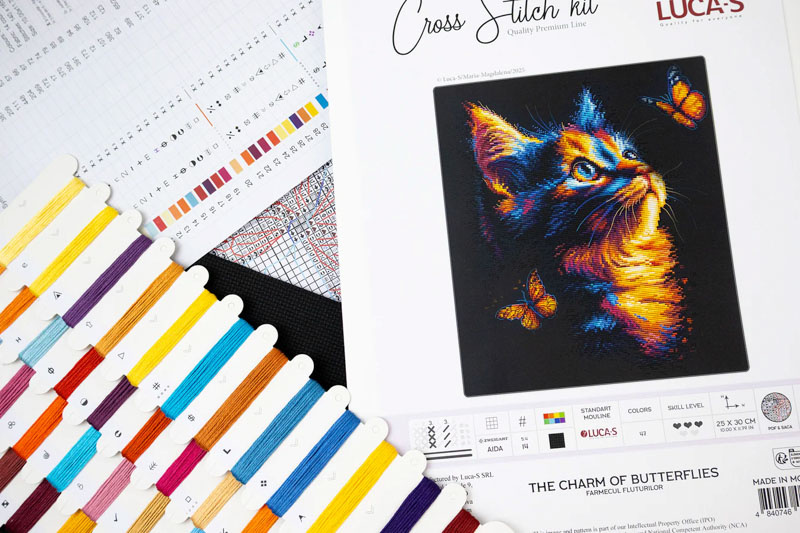 Compleet pakket met voorgesorteerde borduurgarens. Inclusief de benodigde borduurstof, garens, patroon, naald en beschrijving.