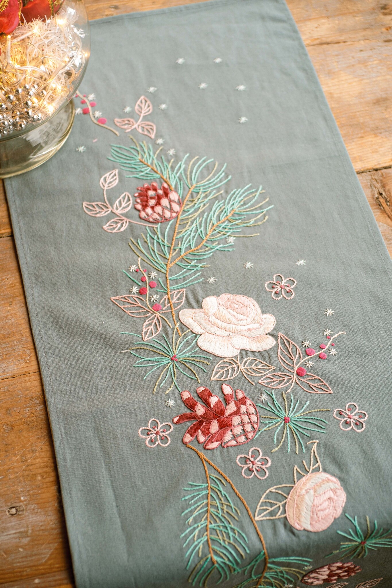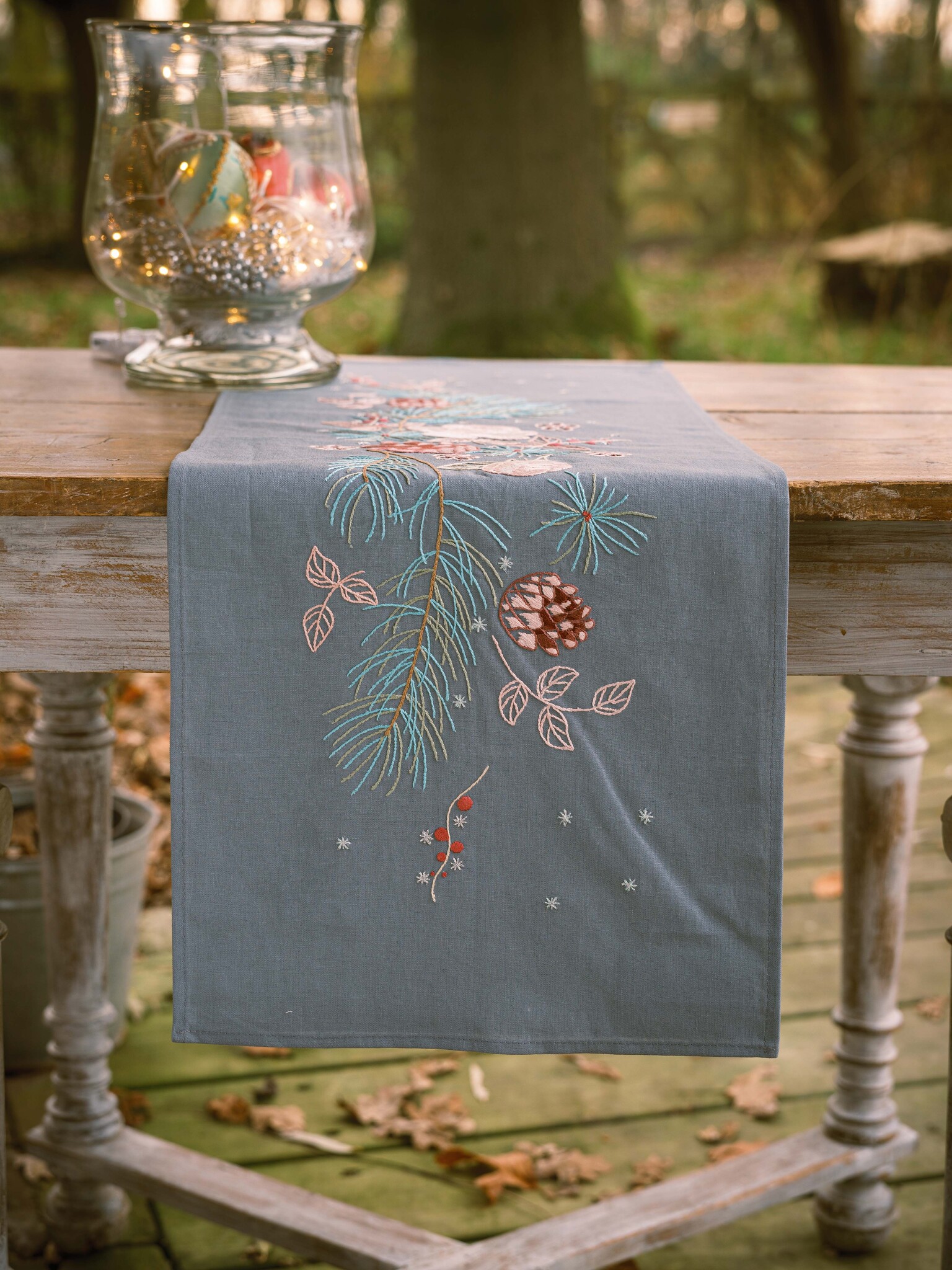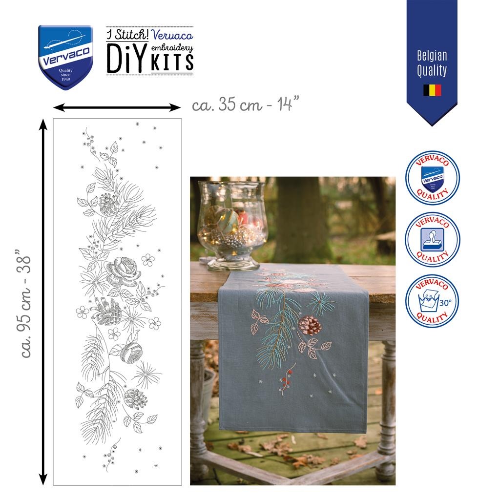 Bedrukte loper met omgezoomde boord, Borduurstof: 50% katoen, 50% linnen, Garen: 100% katoen DMC, Garenkaartje, Werkwijze in 8 talen, Vergroot patroon, Naald, Foto, Uitwasbare verf, Geconfectioneerd, Met goud en zilverdraad ca. 35 x 95 cm / 14" x 38", Leeftijdscategorie: vanaf 15 jaar, Steken: Franse knoop, Kettingsteek, Lange korte steek, Platsteek, Spansteek, Steelsteek, Aantal kleuren: 13, Moeilijkheidsgraad: Moeilijk,