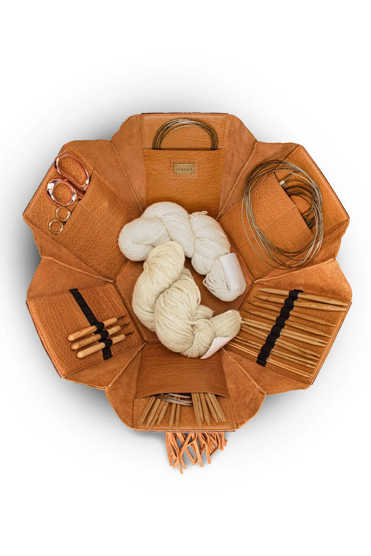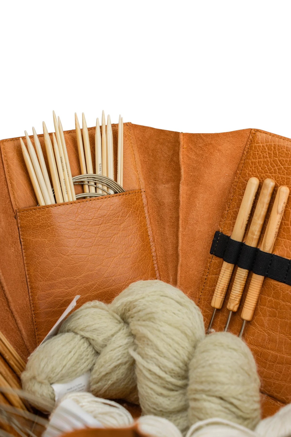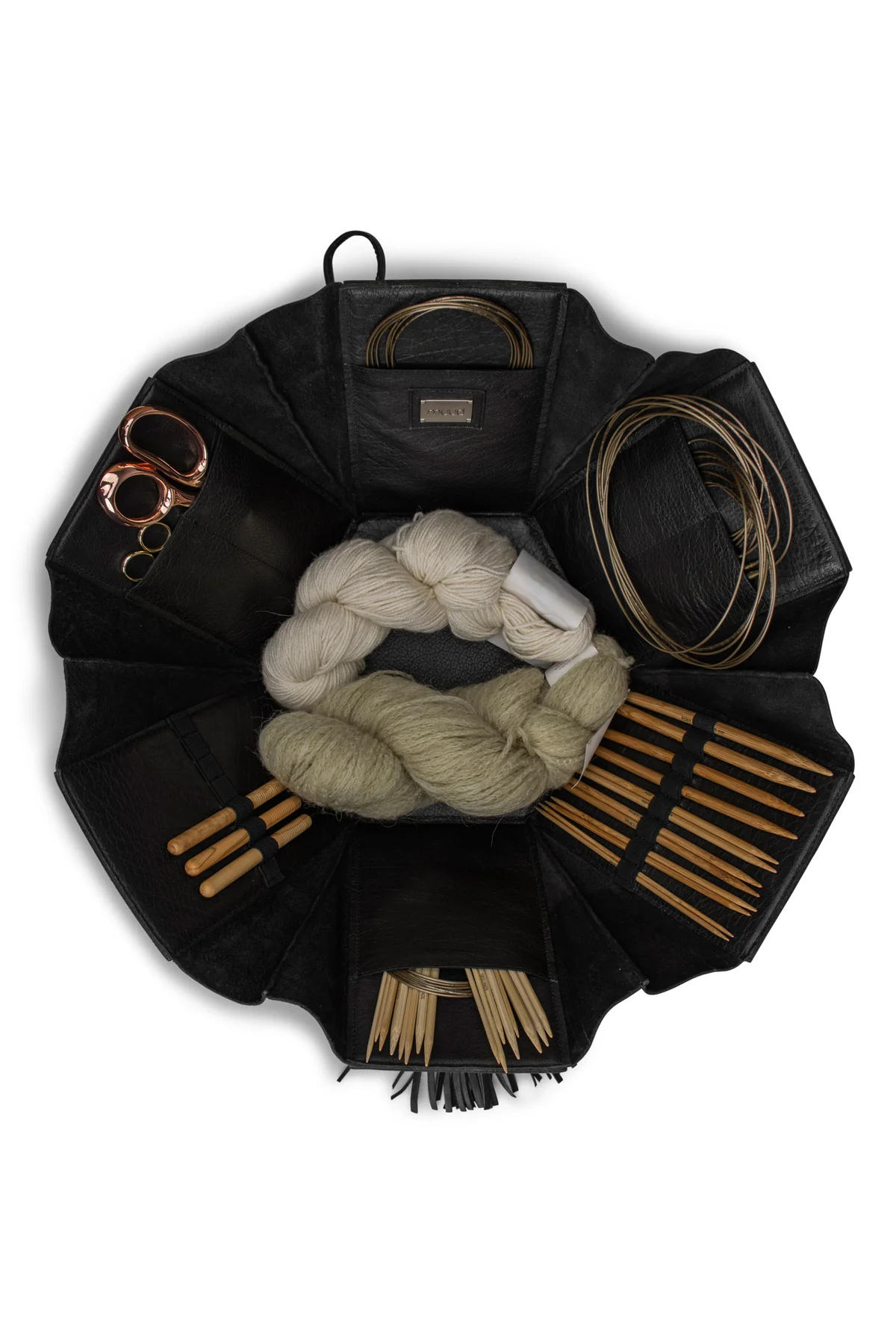 Vouw de doos uit door de leren band aan de buitenkant van de doos los te maken. Gebruik de praktische voeringzakken om je borduurgarens, draden, breinaalden en andere accessoires veilig en georganiseerd te houden.