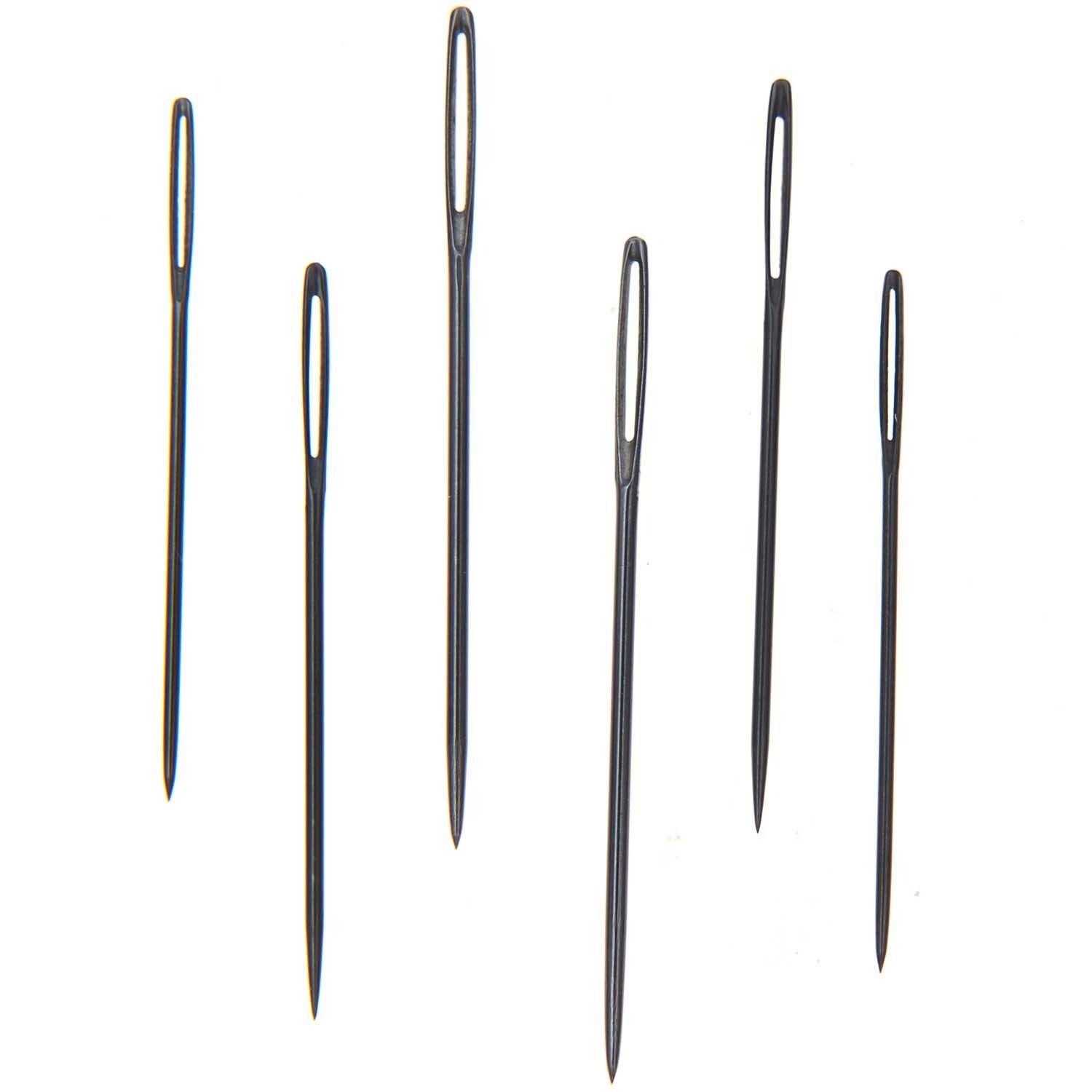 Pakje met scherpe borduurnaalden. Setje van 6 zwarte naalden met punt. De naalden hebben geen nikkelcoating dus ze zijn zwart. Inhoud: 6 stuks in dikte 18, 20 en 22. Lees meer