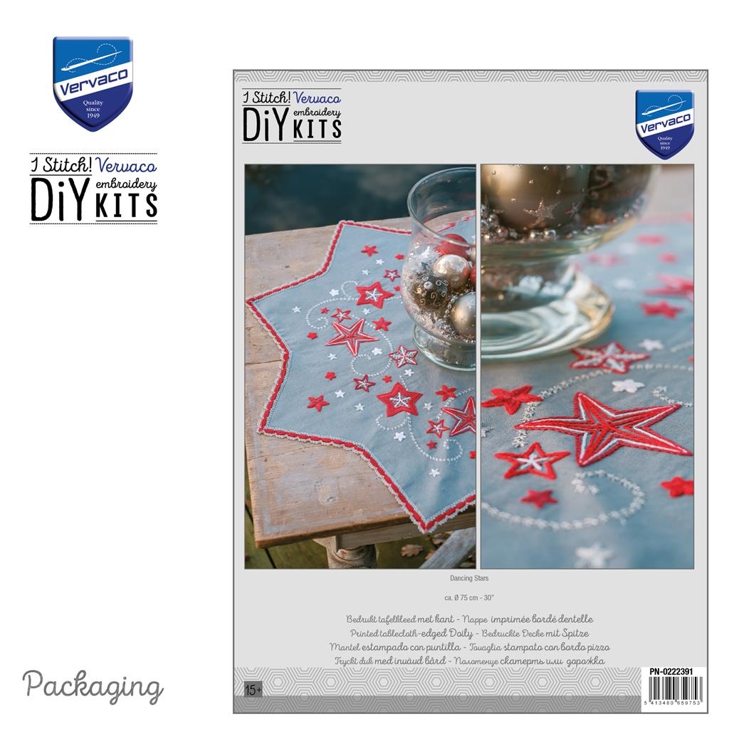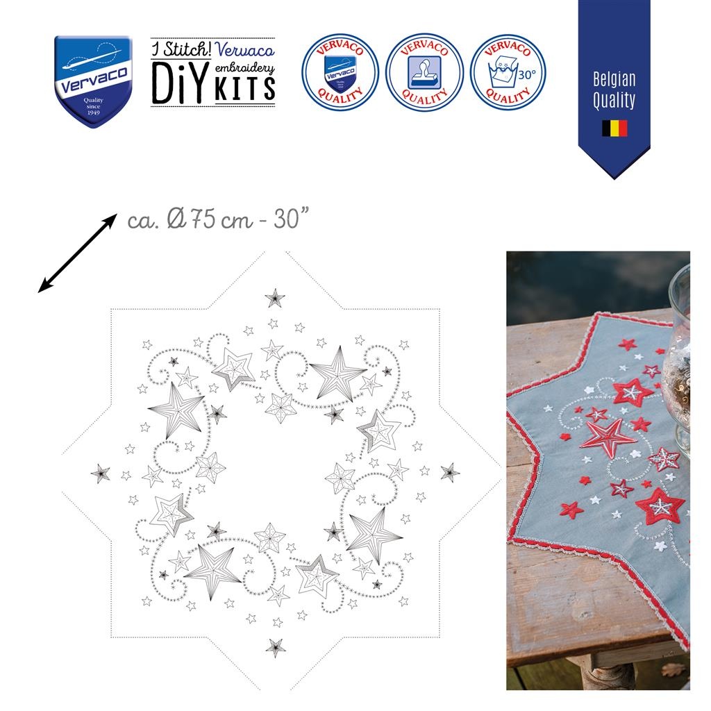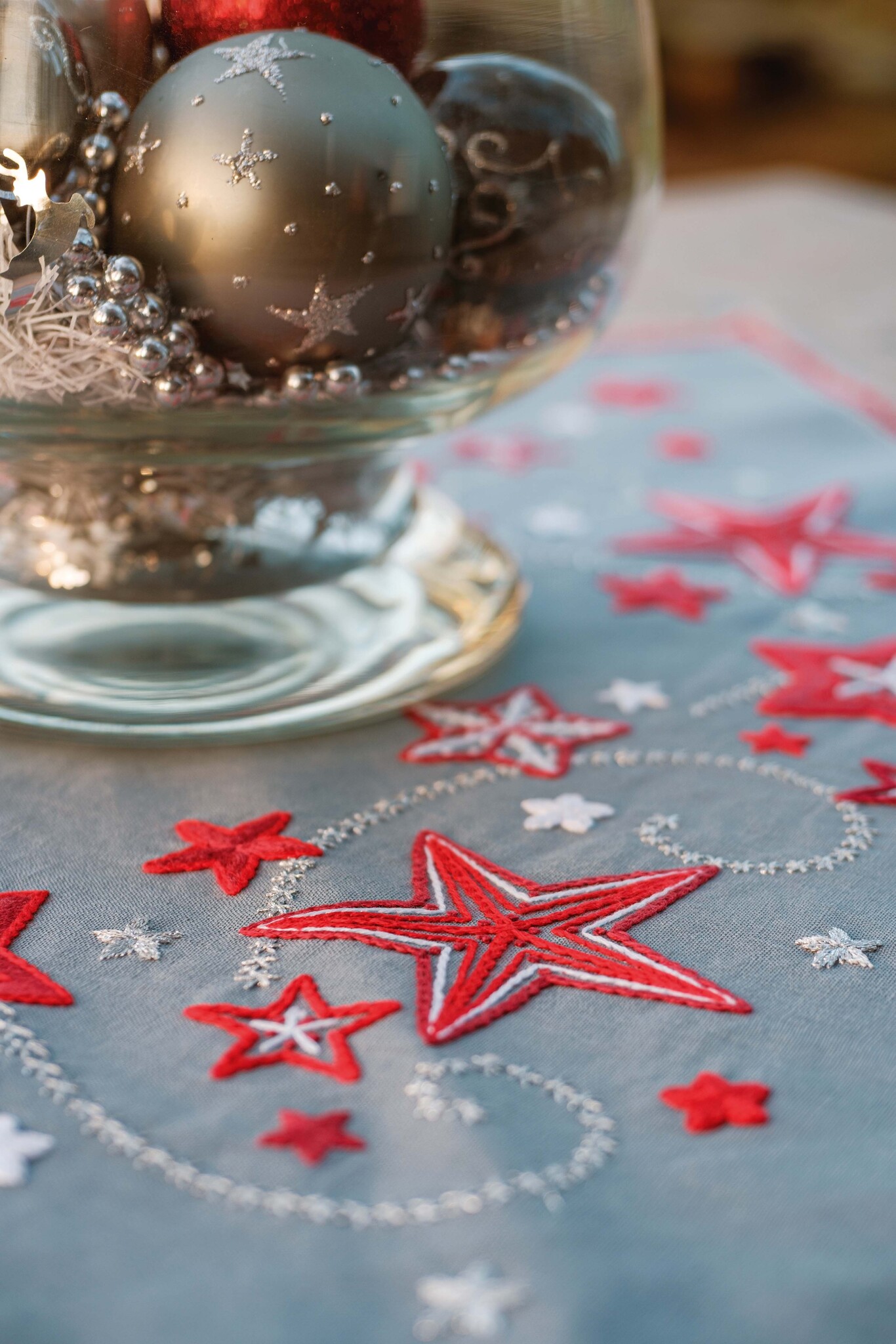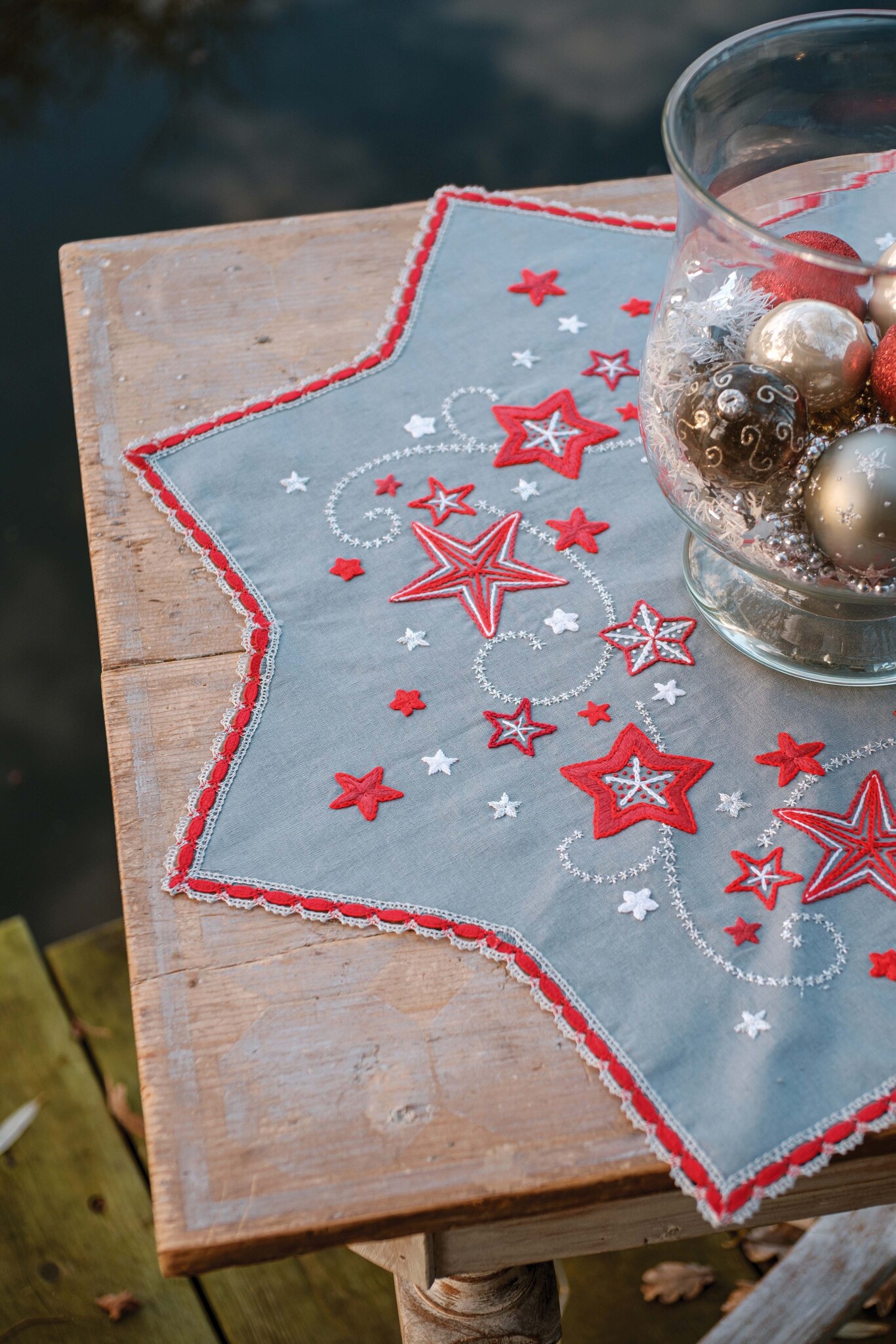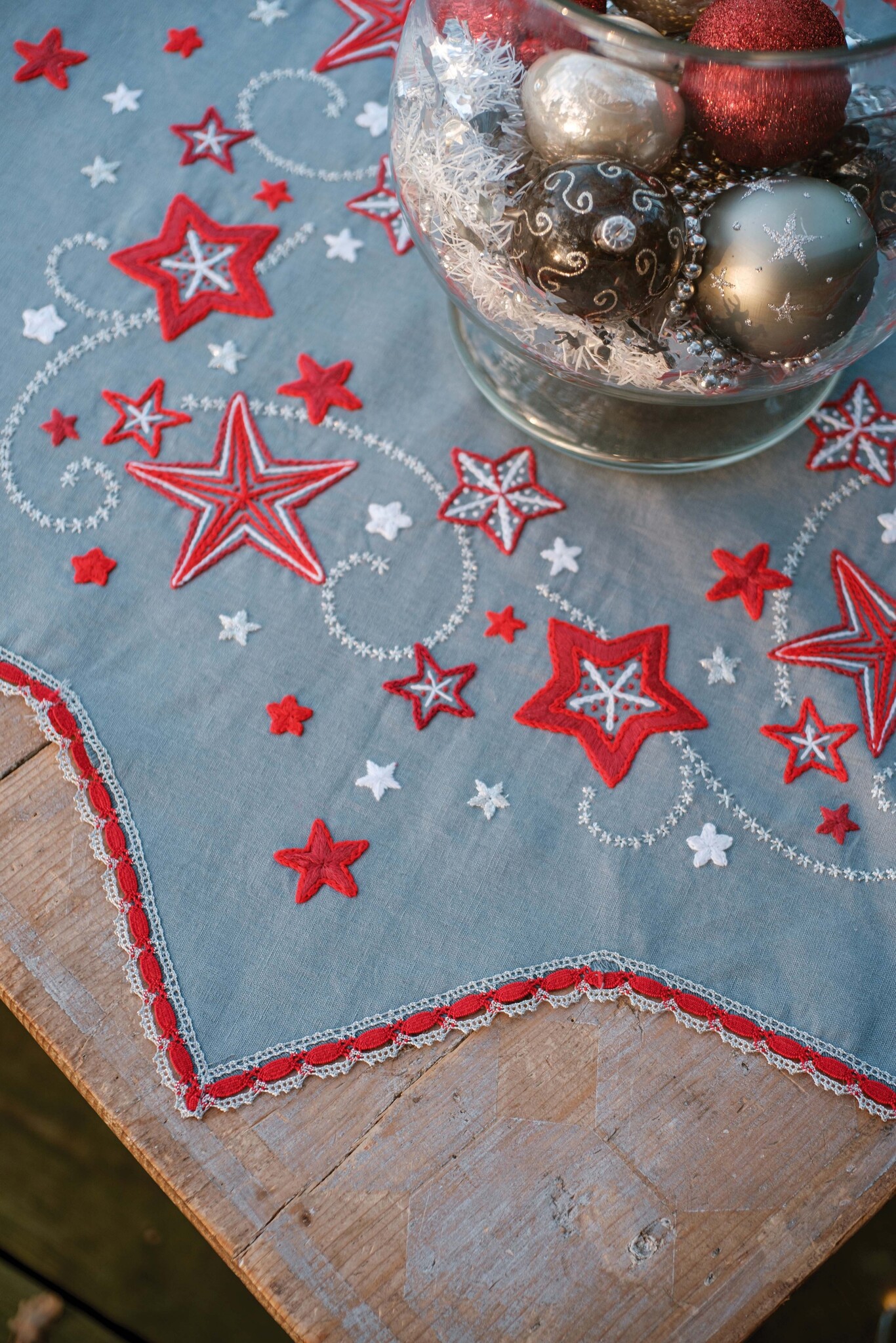 Bedrukt tafelkleed met omgezoomde boord, en kanten boordje Borduurstof: 100% katoen, Garen: 100% katoen DMC, Garenkaartje, Werkwijze in 8 talen, Vergroot patroon - Naald - Foto, Uitwasbare verf, Geconfectioneerd, Met zilverdraad ca. 75 x 75 cm / 30" x 30", Leeftijdscategorie: vanaf 15 jaar, Steken: Franse knoop, Kettingsteek, Platsteek, Spansteek, Steelsteek, Aantal kleuren: 4, Moeilijkheidsgraad: Matig gemakkelijk,