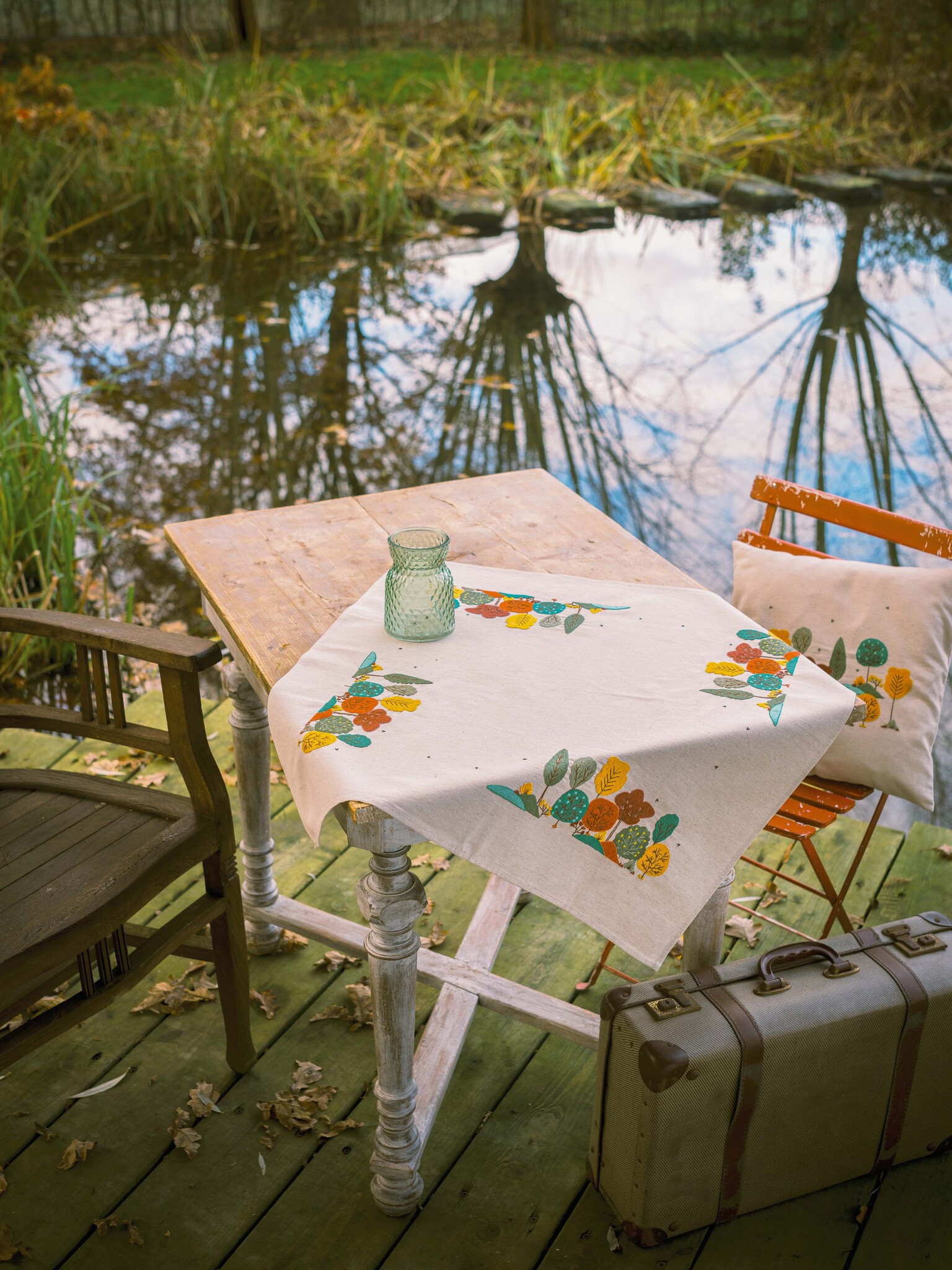 Bedrukt tafelkleed met omgezoomde boord, Borduurstof: 50% katoen, 50% linnen, Garen: 100% katoen DMC, Garenkaartje, Werkwijze in 8 talen, Vergroot patroon, Naald, Foto, Uitwasbare verf, Geconfectioneerd, ca. 72 x 72 cm / 28.8" x 28.8", Leeftijdscategorie: Lees meer