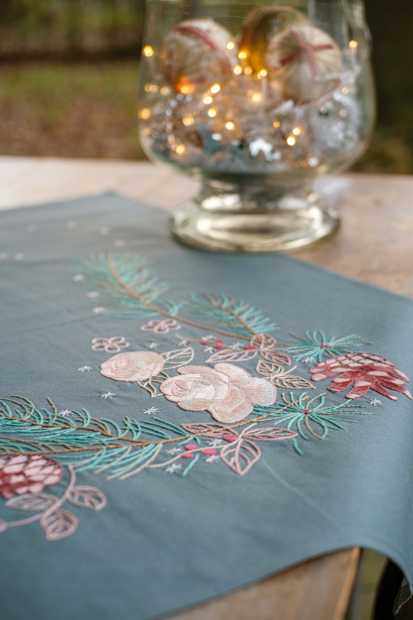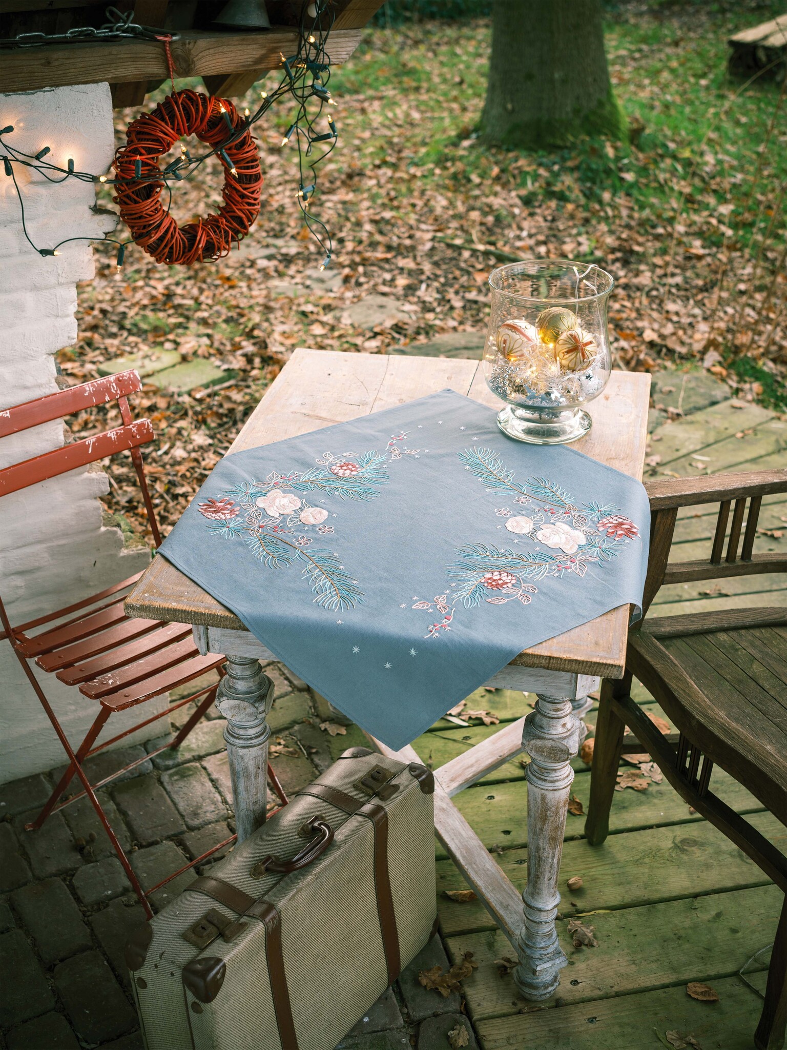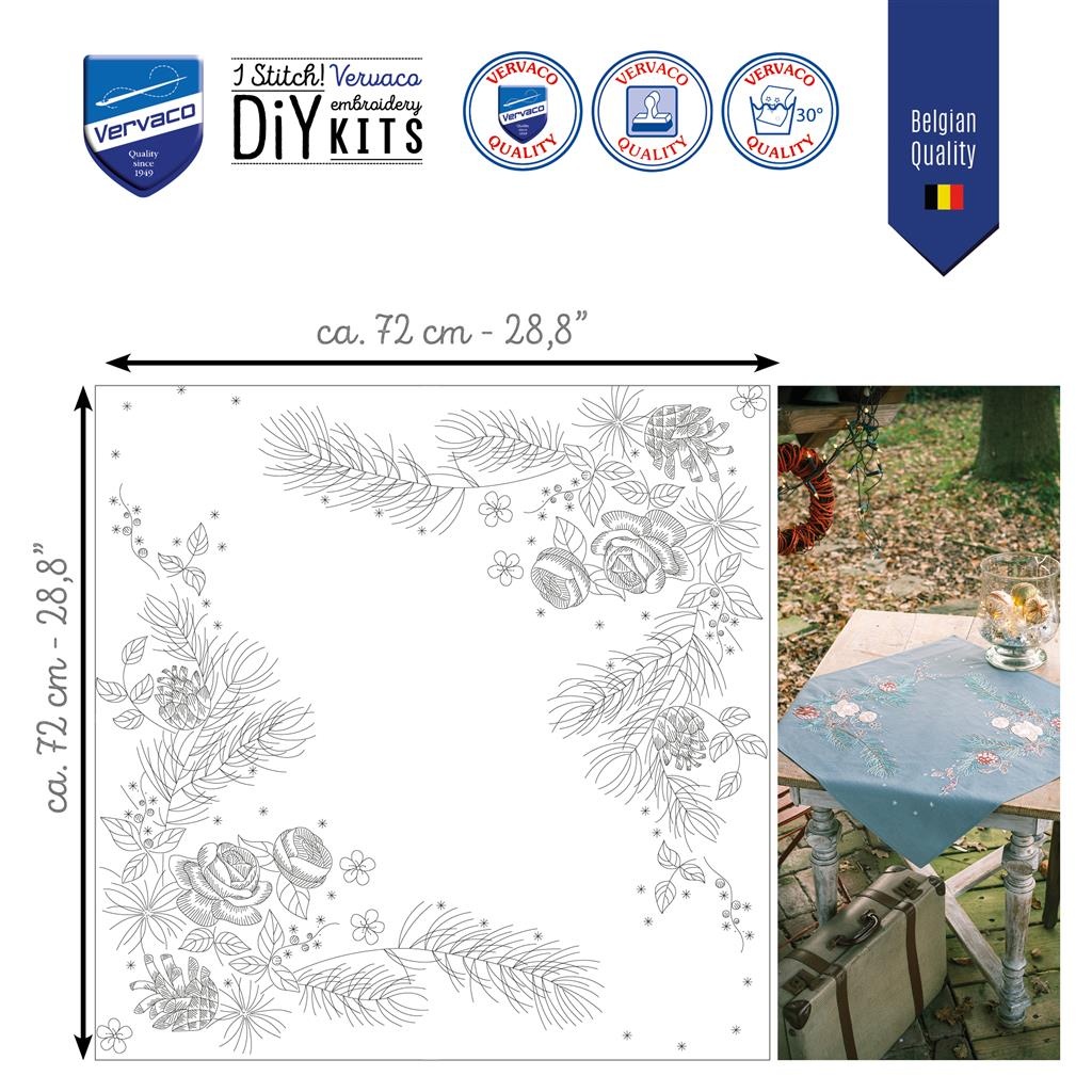 Bedrukt tafelkleed met omgezoomde boord, Borduurstof: 50% katoen, 50% linnen, Garen: 100% katoen DMC, Garenkaartje, Werkwijze in 8 talen, Vergroot patroon, Naald, Foto, Uitwasbare verf, Geconfectioneerd, Met goud en zilverdraad ca. 72 x 72 cm / 28.8" x 28.8", Leeftijdscategorie: vanaf 15 jaar, Steken: Franse knoop, Kettingsteek, Lange korte steek, Platsteek, Spansteek, Steelsteek, Aantal kleuren: 13, Moeilijkheidsgraad: Moeilijk,