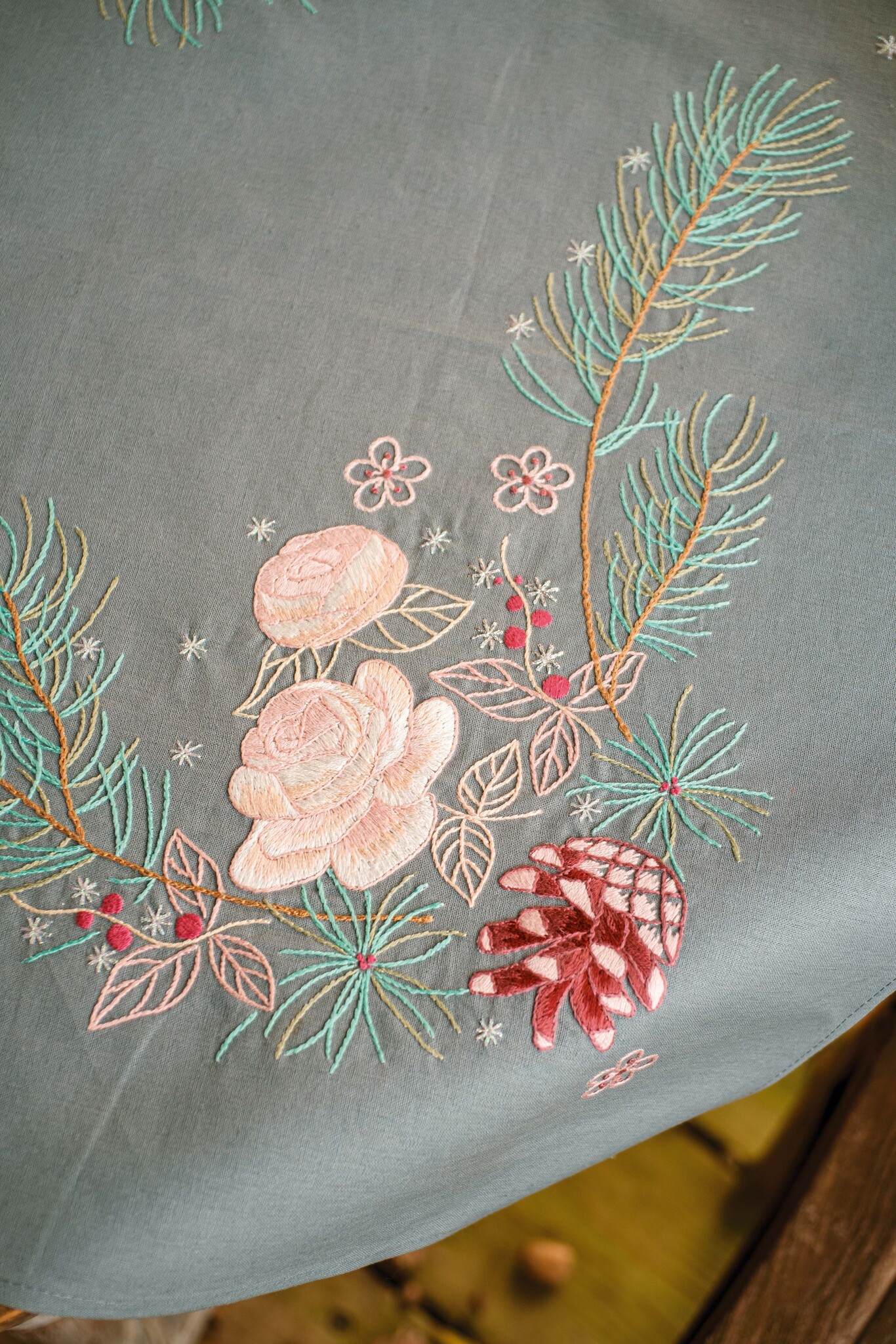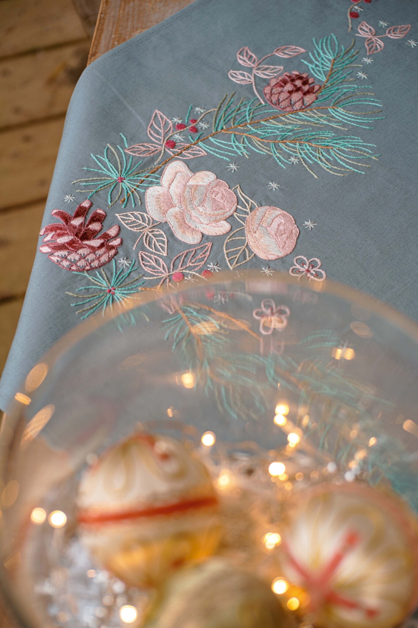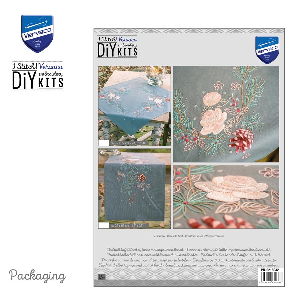 Bedrukt tafelkleed met omgezoomde boord, Borduurstof: 50% katoen, 50% linnen, Garen: 100% katoen DMC, Garenkaartje, Werkwijze in 8 talen, Vergroot patroon, Naald, Foto, Uitwasbare verf, Geconfectioneerd, Met goud en zilverdraad ca. 72 x 72 cm / 28.8" x 28.8", Leeftijdscategorie: vanaf 15 jaar, Steken: Franse knoop, Kettingsteek, Lange korte steek, Platsteek, Spansteek, Steelsteek, Aantal kleuren: 13, Moeilijkheidsgraad: Moeilijk,