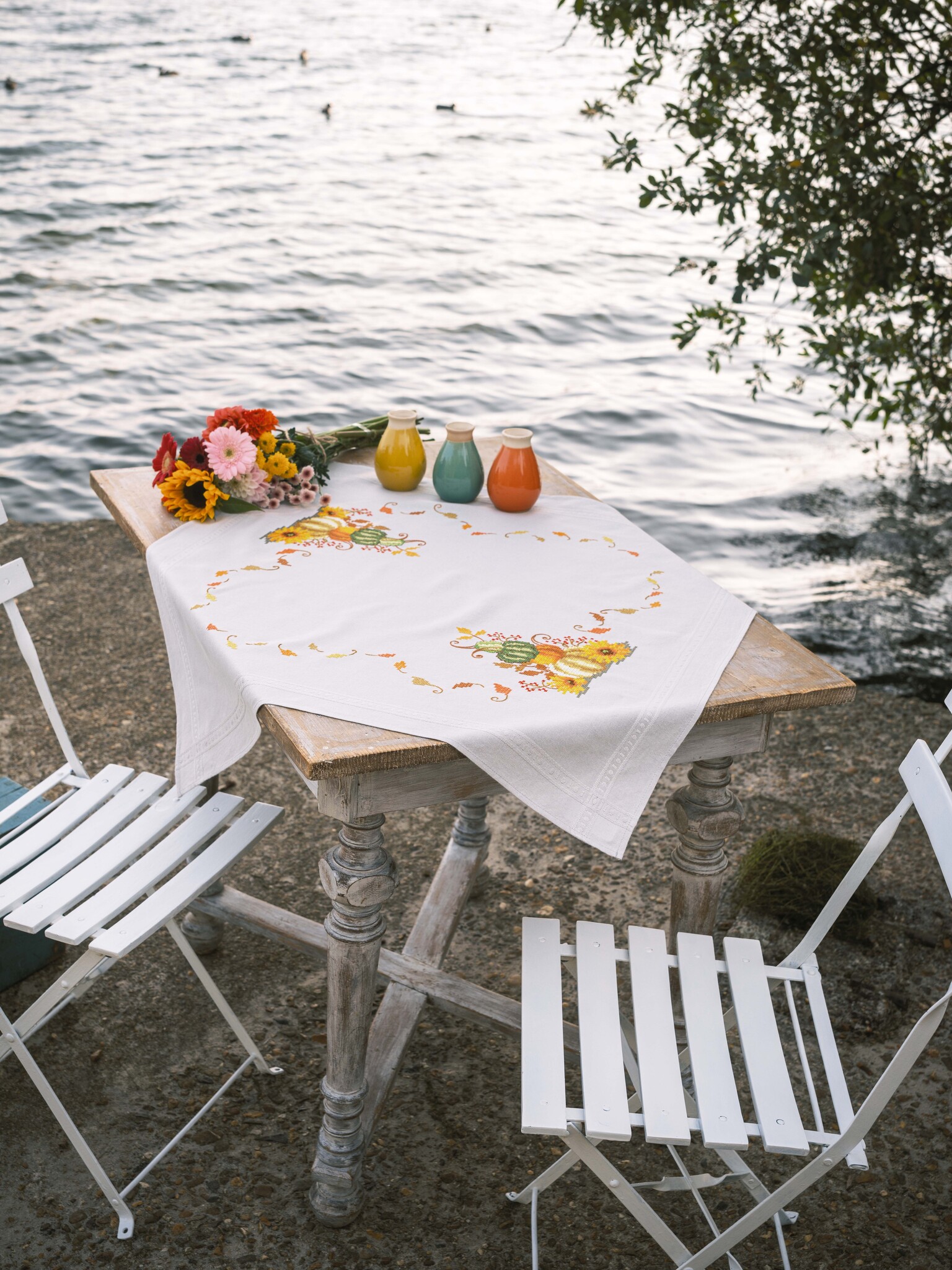 Bedrukt tafelkleed met ingeweven boord, Borduurstof: 100% katoen, Garen: 100% katoen DMC, Garenkaartje, Werkwijze in 8 talen, Vergroot patroon, Naald, Foto, Uitwasbare verf, Geconfectioneerd, ca. 80 x 80 cm / 32" x 32", Leeftijdscategorie: vanaf 15 jaar, Lees meer
