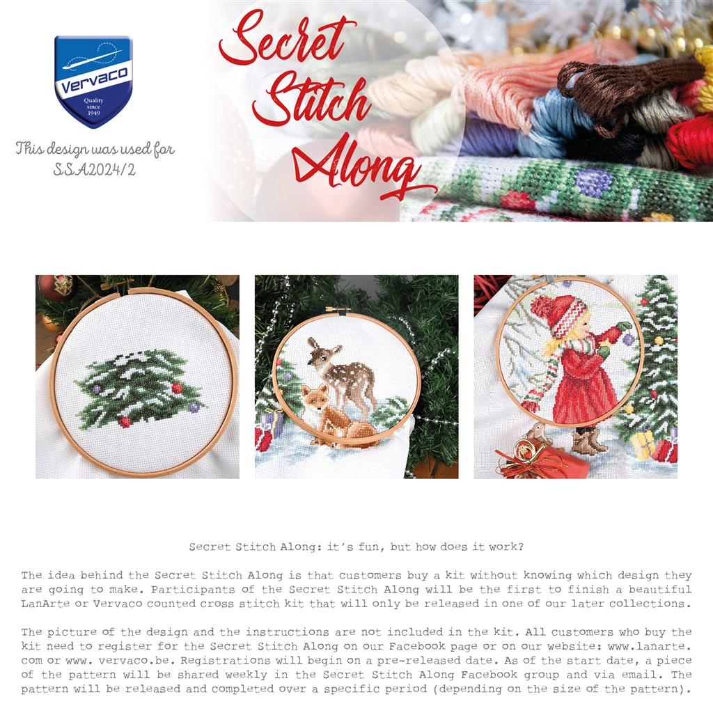 Het pakket wordt compleet geleverd inclusief de benodigde borduurstof (10-draads handwerkstof of 5,4 aida naar keuze), garens, patroon, naald en beschrijving. Dit pakket was de Secret Stitch Along van 2024/2! Lees meer